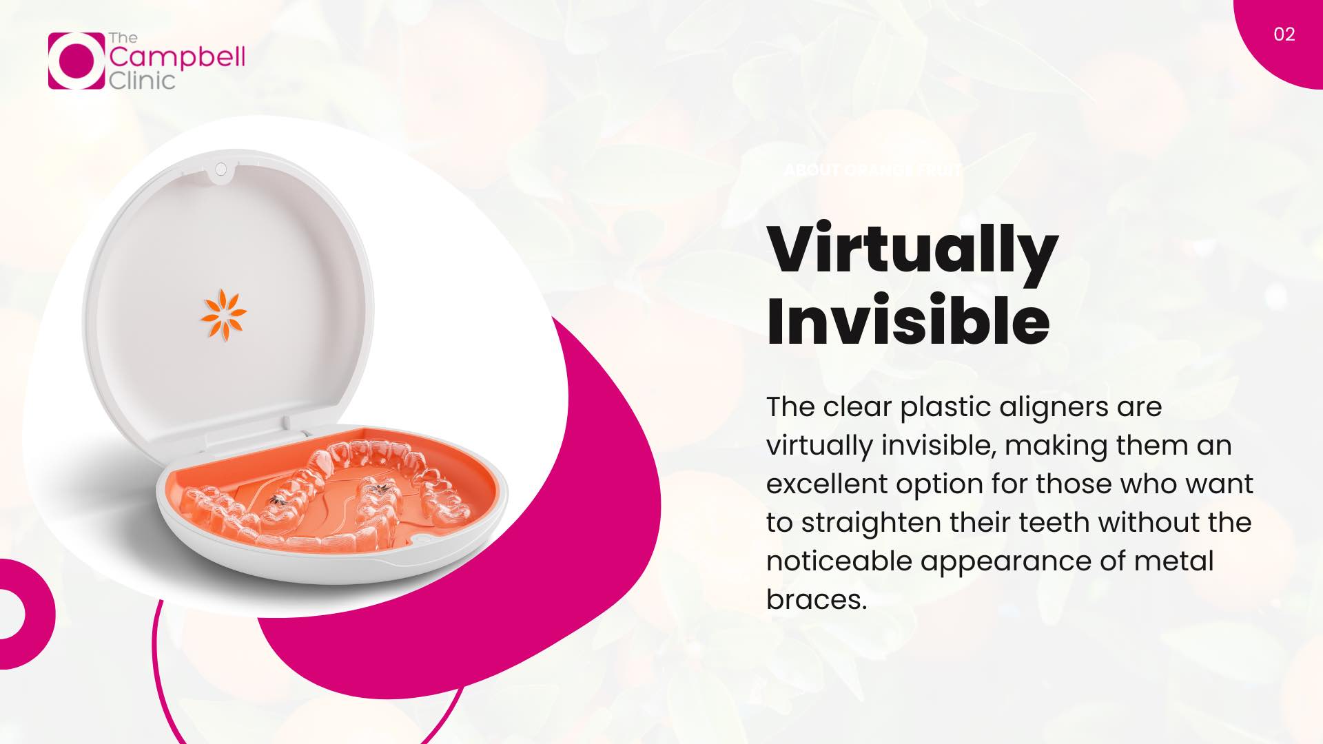 1. Virtually Invisible: The clear plastic aligners are virtually invisible, making them an excellent option for those who want to straighten their teeth without the noticeable appearance of metal braces.