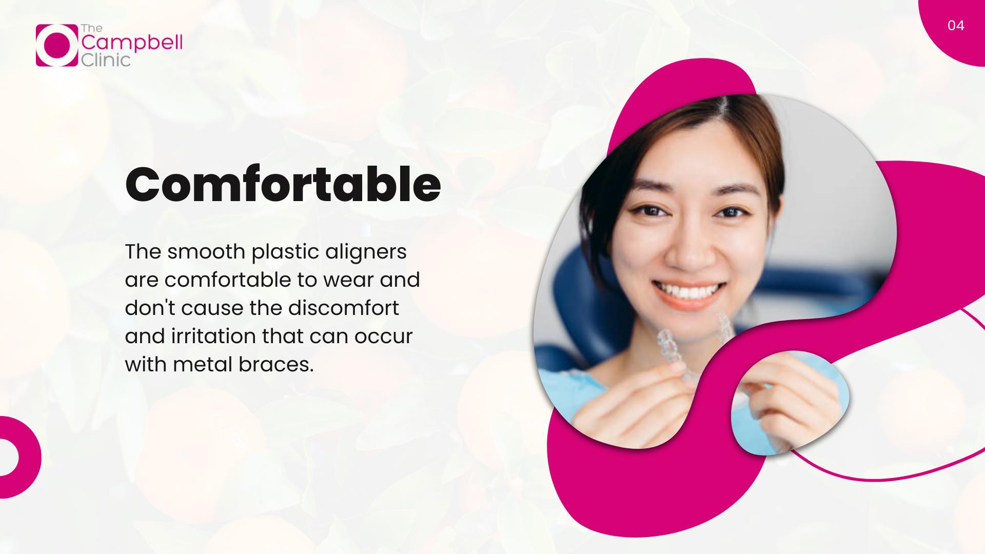 3. Comfortable: The smooth plastic aligners are comfortable to wear and don’t cause discomfort and irritation that can occur with metal braces.